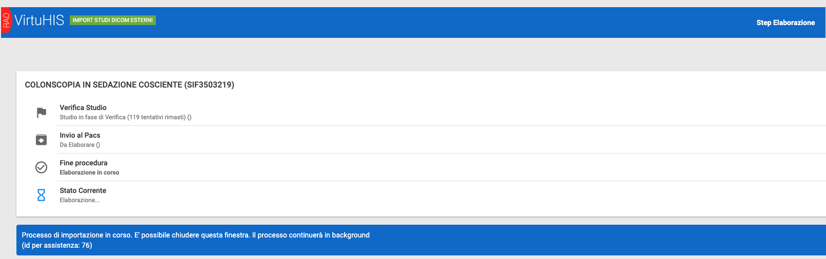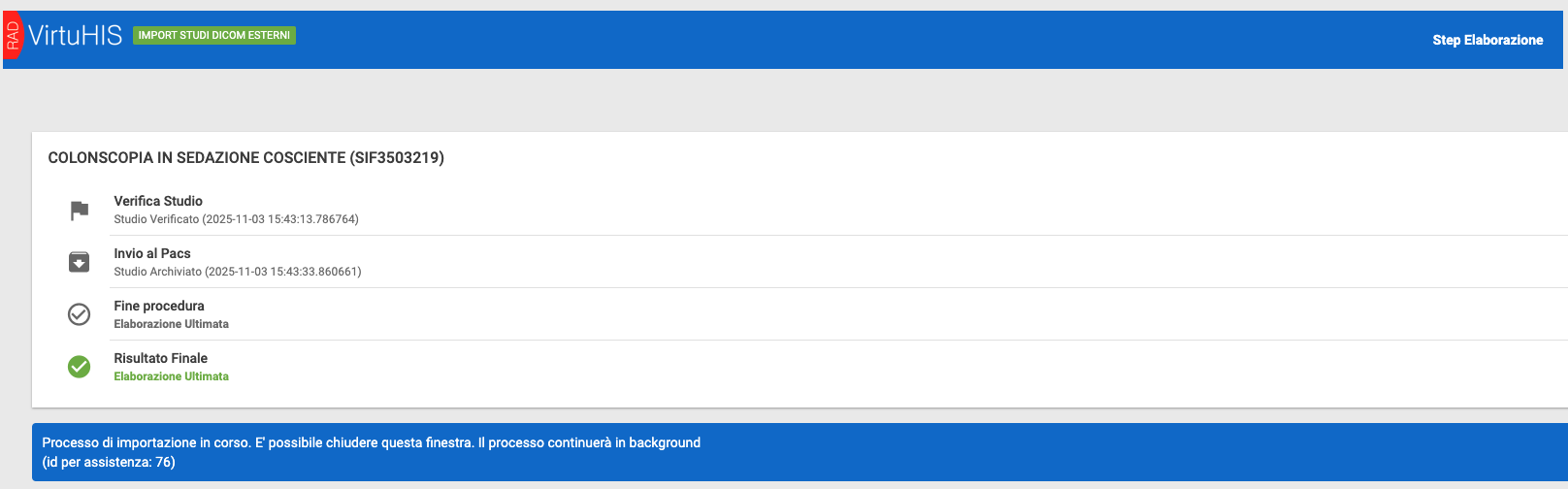 Invio Ordine RIS: (Anche questa fase è attiva solo se configurata). Se abilitata, il sistema aggiorna automaticamente lo stato dell'ordine nel sistema RIS (Radiology Information System), comunicando che l'importazione dello studio è stata completata o è in corso.